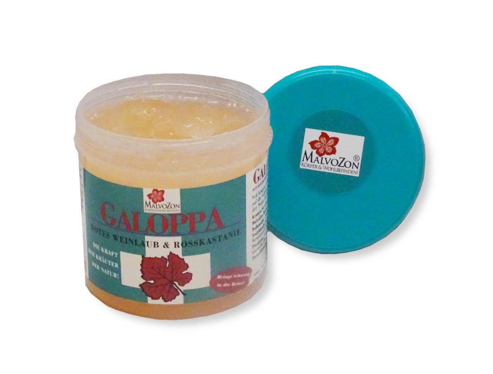 Diese Pferdesalbe ist für die Beine gemacht. Die Volksheilkunde kennt für viele Probleme ein Kraut, die durch moderne Medizin in Vergessenheit geraten sind, obwohl hier die Grundlage der Pharmazie liegen. Rotes Weinlaub und Rosskastanie-Blüte sind bekannte Wirkstoffe, die bei Problemen mit den Venen gerne Verwendung finden. Lärchenöl hat eine antibakterielle, entzündungshemmende Wirkung. Wegwarte beruhigt die Haut. Menthol und Kampher geben Frische und lindern die müden Beine. Galoppa besitzt ein komplexes Gesamtpaket an vielen Kräutern, die eine Wohltat für die Beine sind.